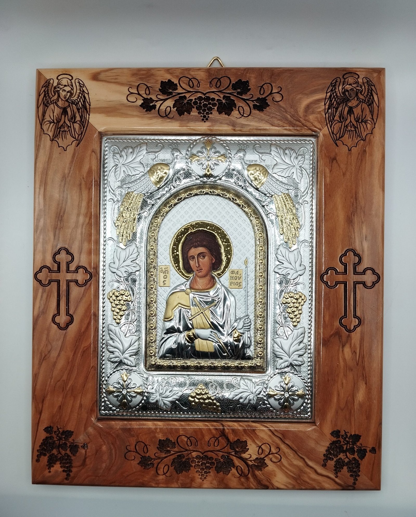 Επιχρυσωμένη εικόνα του Αγίου Φανουρίου από ασήμι με πλαίσιο από ξύλο ελιάς από τους Αγίους Τόπους (33*28 εκ.)