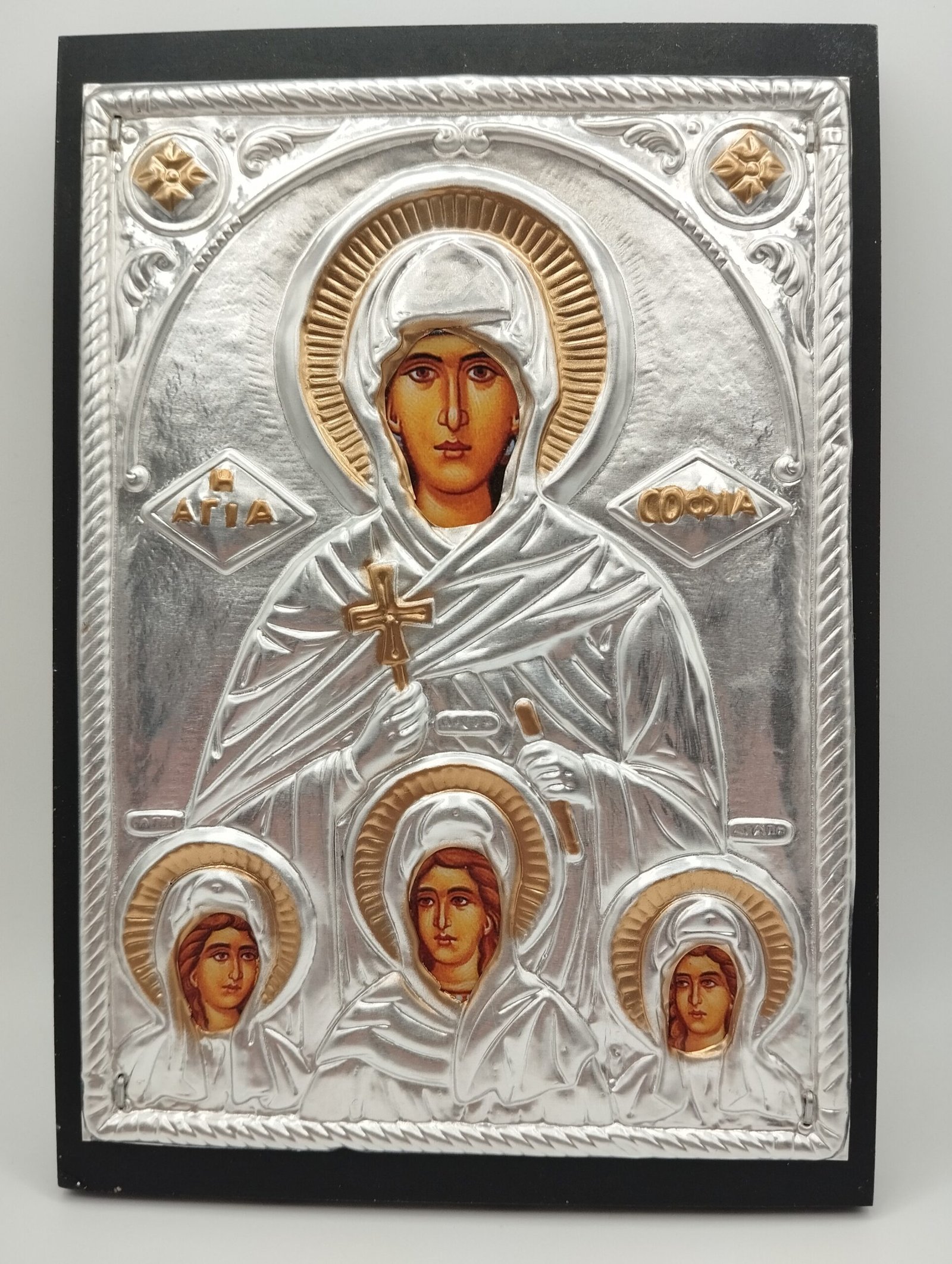 Επάργυρη εικόνα των Αγίων Σοφίας, Πίστης, Αγάπης και Ελπίδας (15*20 εκ.)