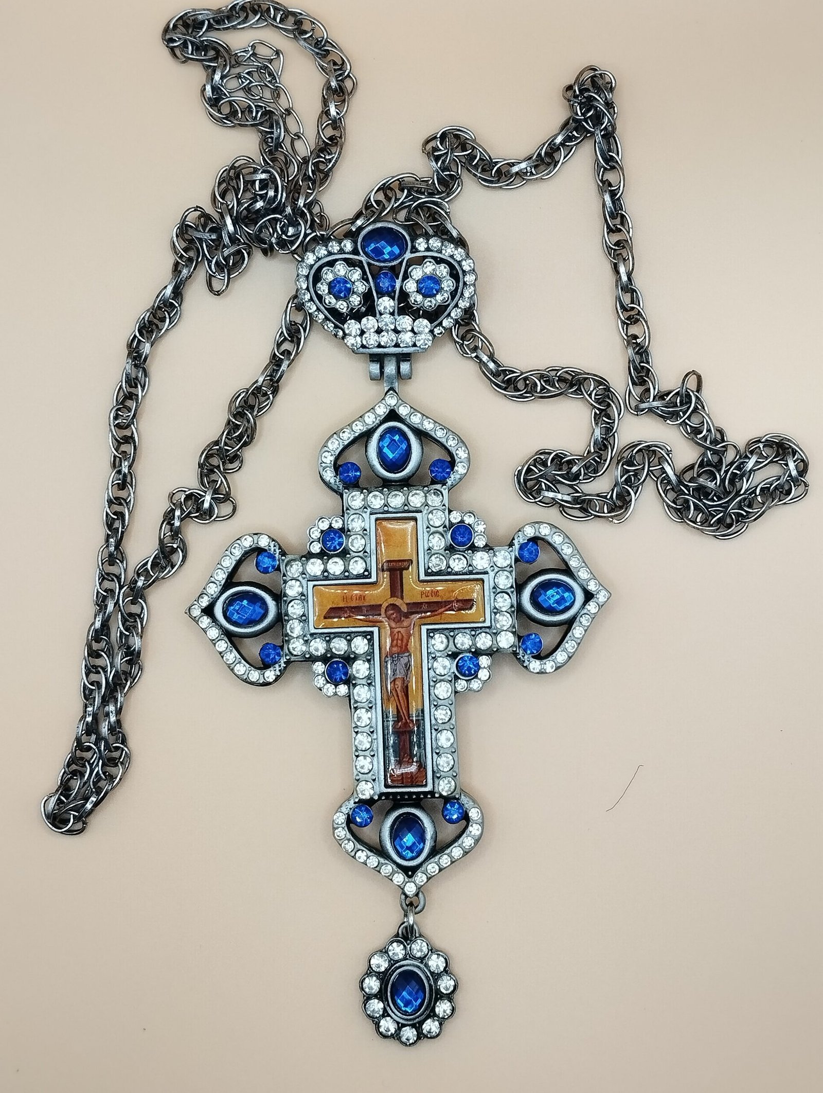 Επιστήθιος μεταλλικός σταυρός σε ασημί χρώμα με μπλε λεπτομέρειες (16 εκ.)