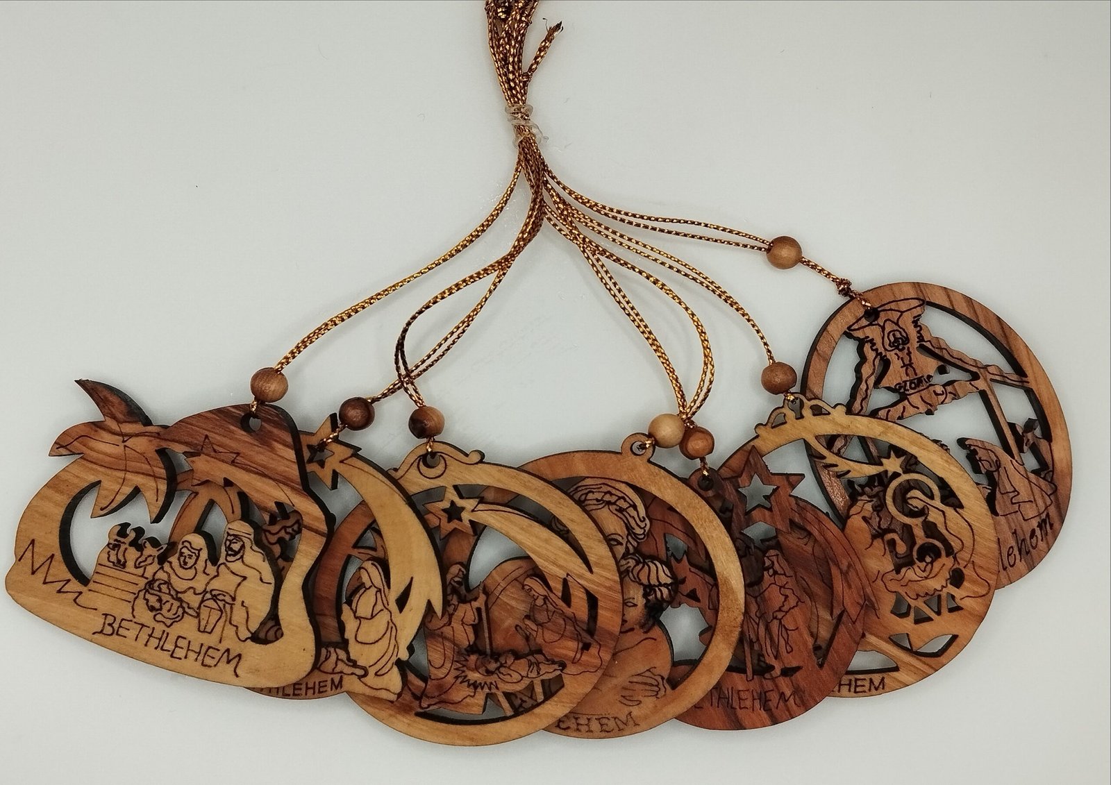 Σετ χριστουγεννιάτικων στολιδιών (7 τεμάχια) με διάφορες παραστάσεις από ξύλο ελιάς από την Βηθλεέμ
