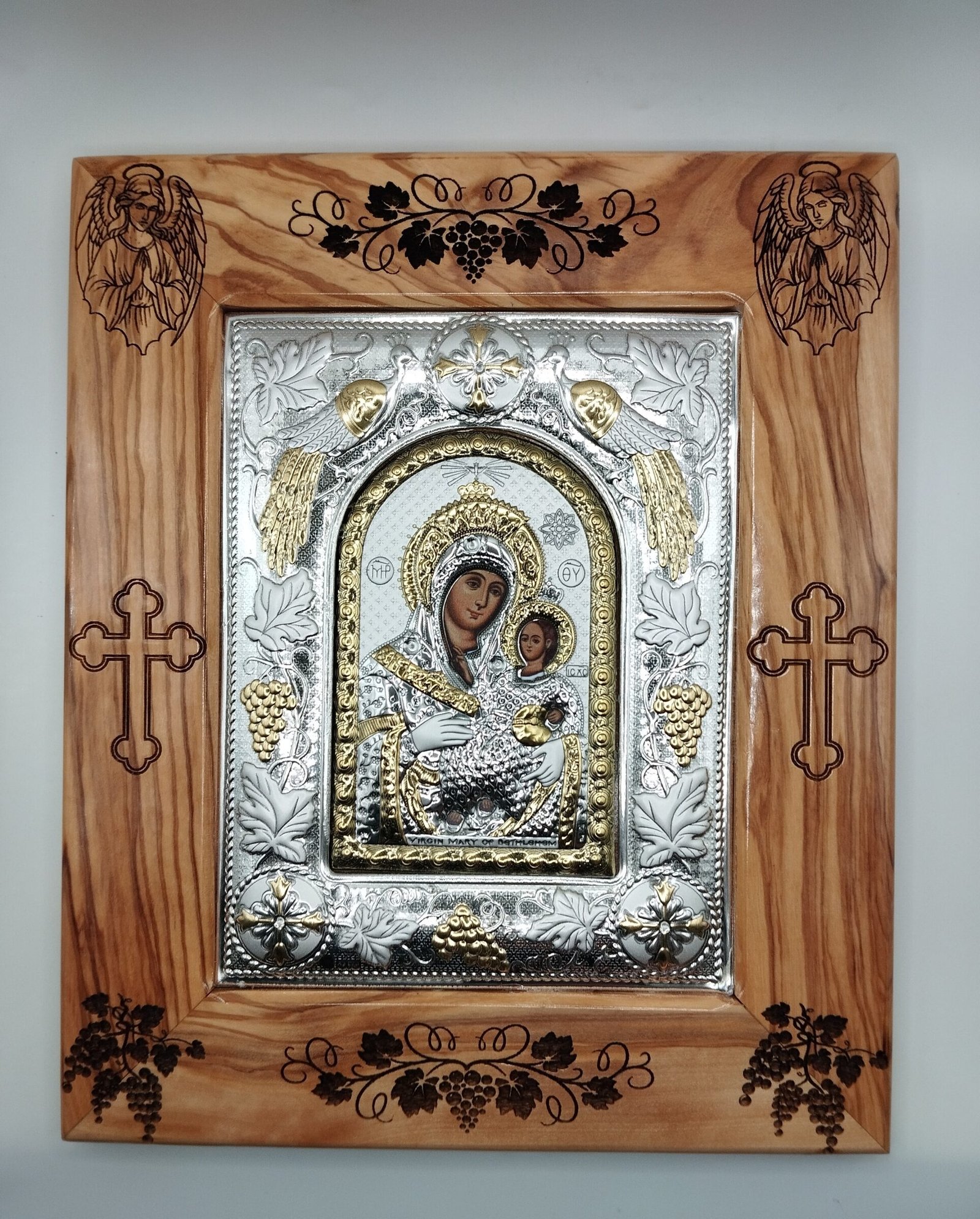 Επιχρυσωμένη εικόνα της Παναγίας της Βηθλεεμίτισσας από ασήμι με πλαίσιο από ξύλο ελιάς από τους Αγίους Τόπους (26*21 εκ.)
