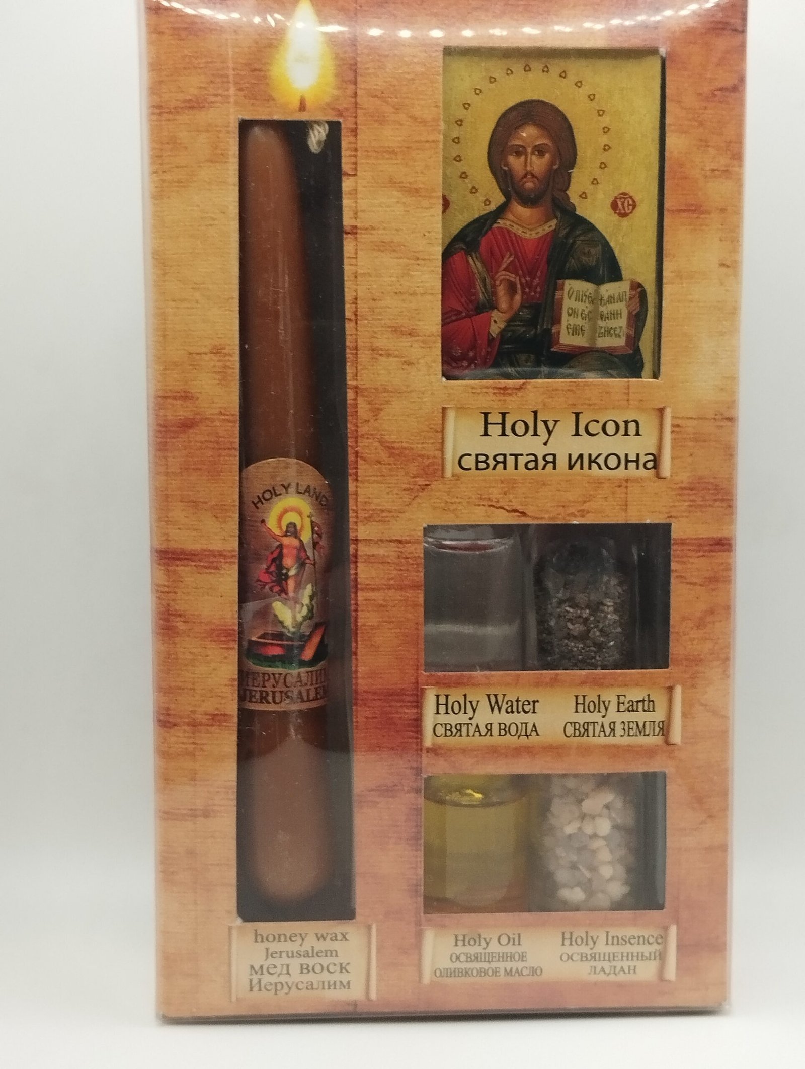 Σετ ευλογίας από τους Αγίους Τόπους που περιλαμβάνει χώμα, λιβάνι, αγιασμό, λάδι, μια εικόνα και μια λαμπάδα από μελισσοκέρι